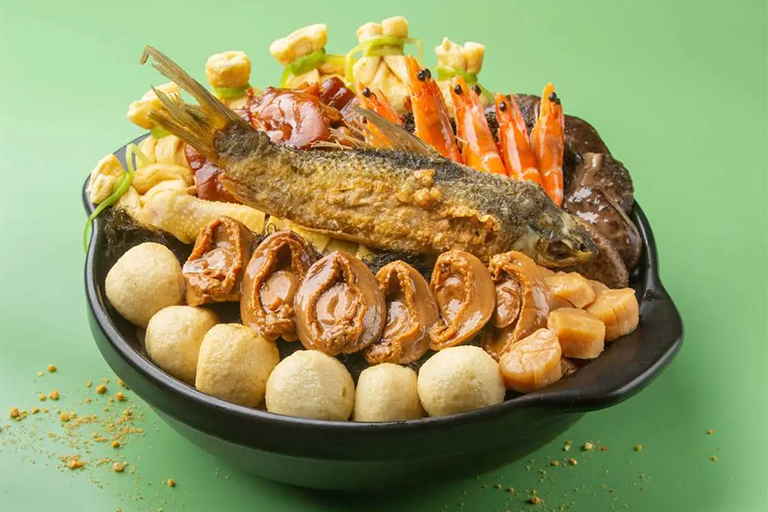 原隻八頭鮑魚、原粒瑤柱甫、美顏花膠、茄汁大蝦、香滑鯪魚球、頭抽豉油雞、鮑魚汁炆鵝掌、自家製南乳豬手、炆豬脷、芋頭扣肉、蠔皇花菇、豬皮、竹笙、鮮草菇、炆蓮藕、蘿蔔、豆卜、枝竹及紹菜