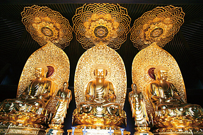 山門象徵三種解脫煩惱的法門,為寺院中軸線的起點。兩側青銅鑄金剛力士威武屹立,守護寺院。參學者拾級而上,寓意放下貪、瞋、痴,以清淨之心進入解脫之門。
